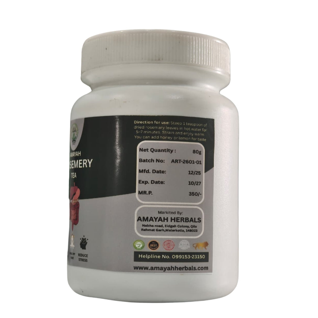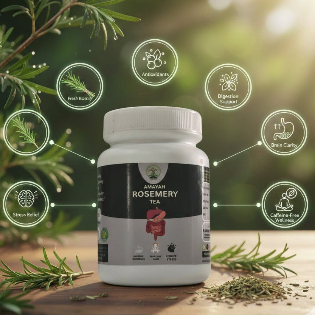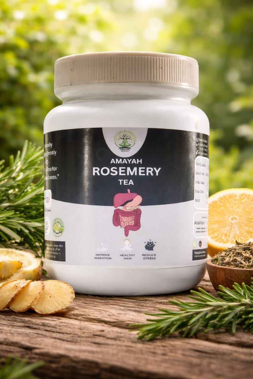 Amayah Rosemary Tea is a premium herbal tea made from carefully selected, naturally dried rosemary leaves. Known in Ayurveda and traditional wellness practices, rosemary supports digestion, hair health, mental relaxation, and overall vitality. This soothing herbal infusion helps cleanse the system from within while promoting calmness and daily wellness.Free from chemicals and artificial additives, Amayah Rosemary Tea is ideal for daily consumption and can be enjoyed warm for maximum benefits.